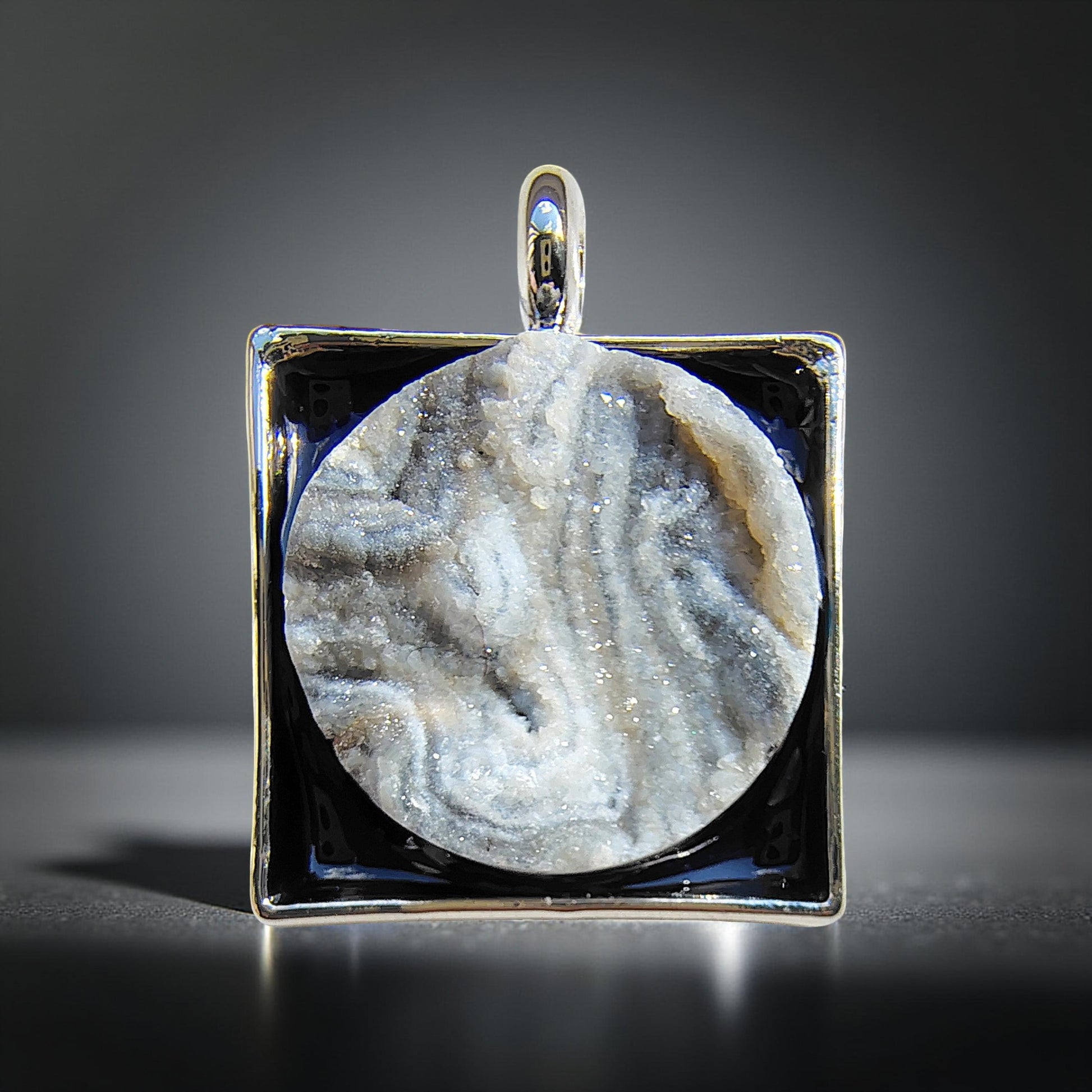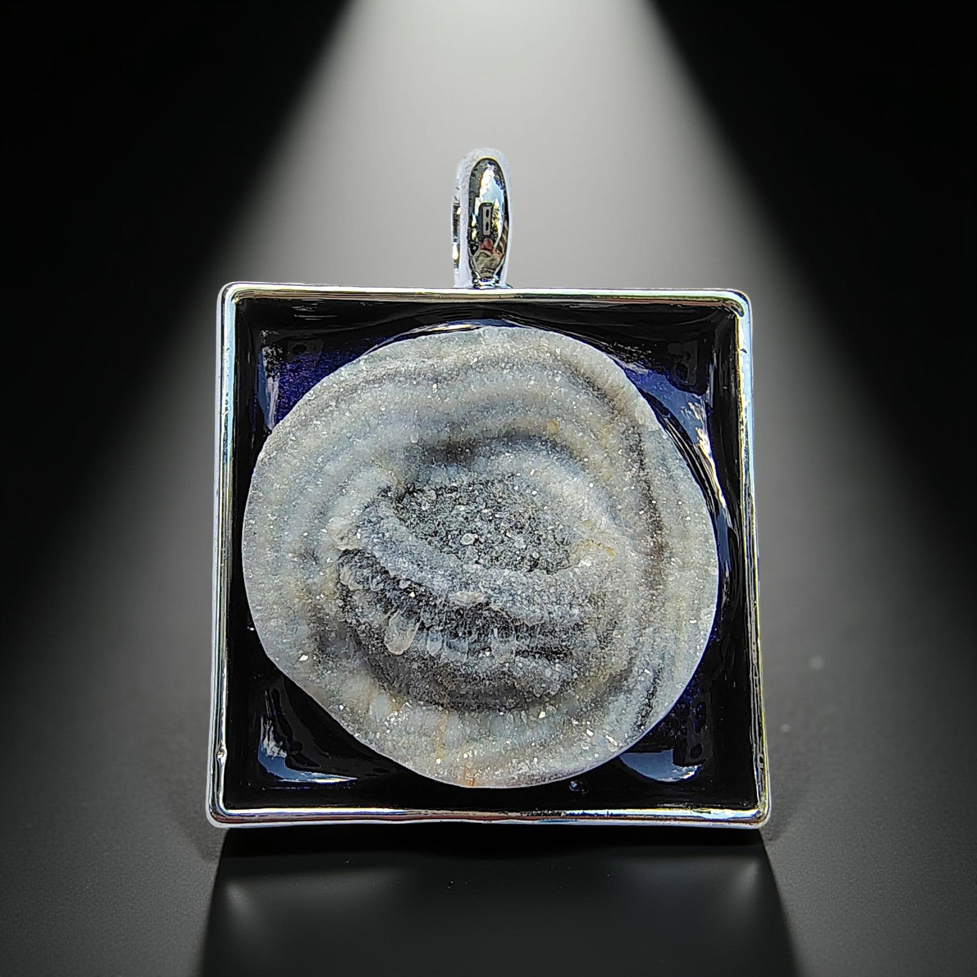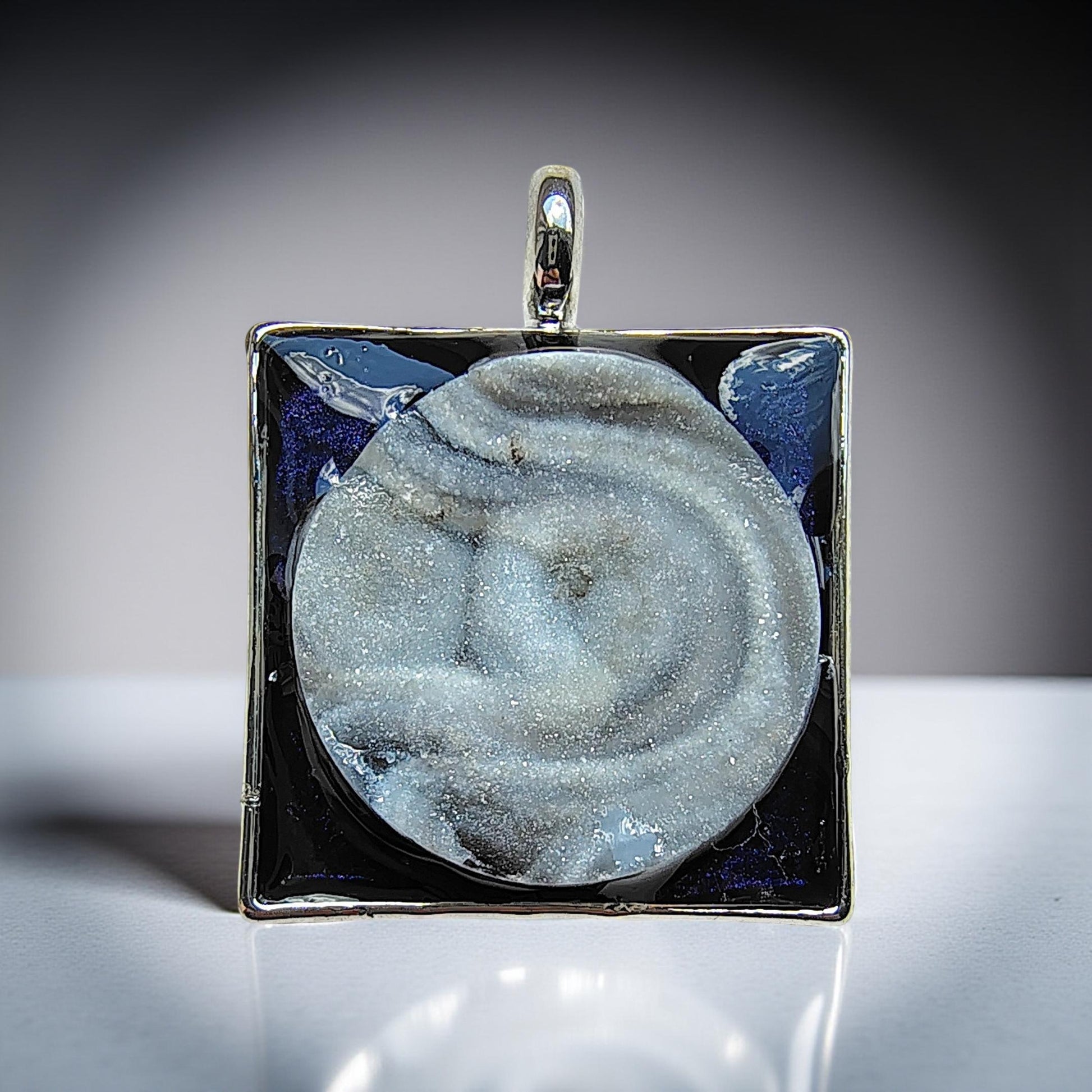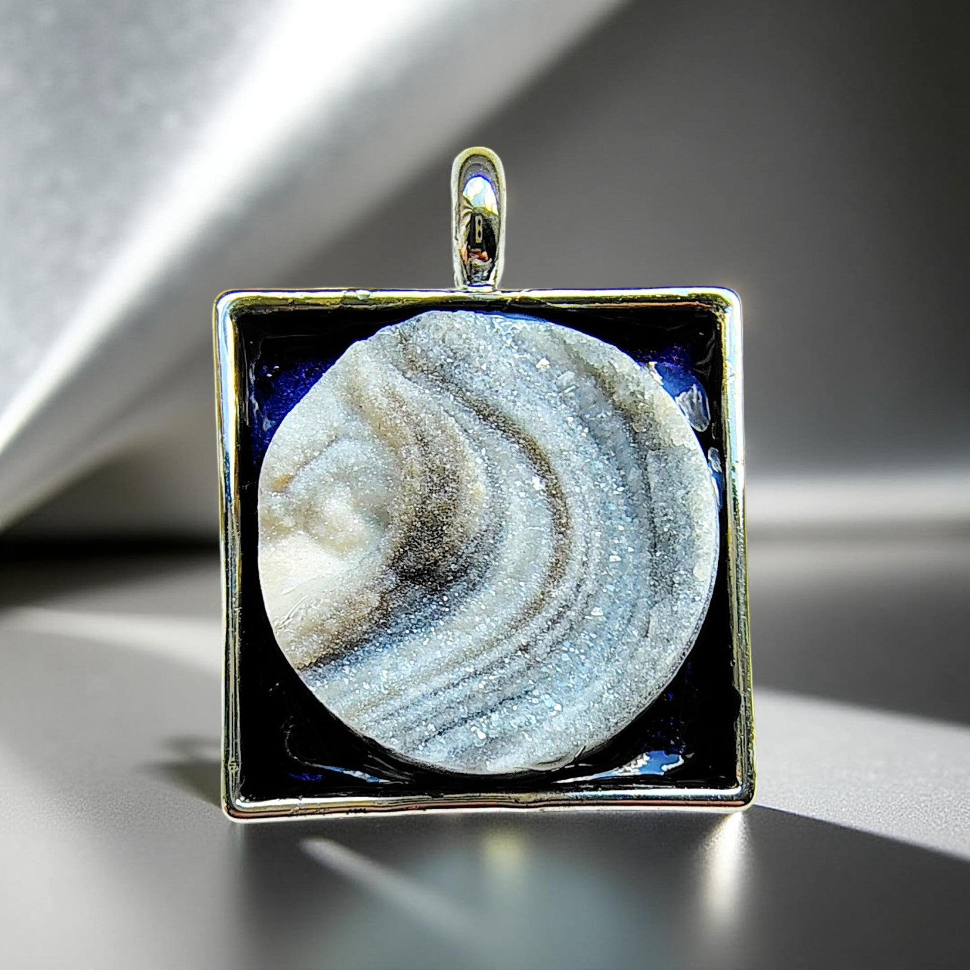 With a harmonious blend of contemporary aesthetics and subtle glamour. This meticulously hand crafted Full Moon Druzy necklace, showcases delicate sugar-like sparkling crystals, creating a captivating, light catching effect. Known for bringing balance, harmony, and strengthened intuition. Featuring a captivating midnight sky blue backdrop, elegantly encased in a sleek silver-toned square setting.